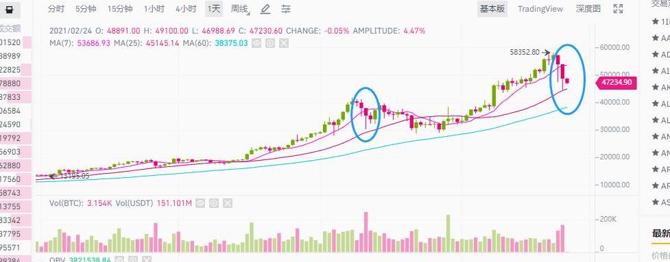 从第一个原因来看,BTC确实是刚刚经历了从30000美元到58000美元的快速上涨,回调幅度暂时还没有达到1月的水平。上一波回调时长半个月,这一波有可能在下周继续下探。