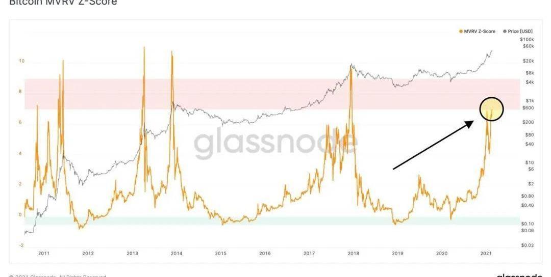 比特币的MVRV-Z评分指标通常用于衡量一项资产是否被低估或高估。当这个指标到达下面所示的红色区域顶部时,它表明市场可能被高估了。