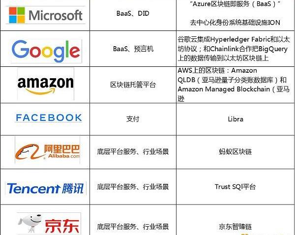 具体来看,目前巨头主攻的方向包括:ToB底层平台、区块链+物联网、以及ToC行业应用。海外巨头中,微软布局区块链最早、目前市场参与度最深:其于2015年开始布局,目前已形成务已形成基于Azure云服务的区块链生态系,覆盖IaaS、PaaS至SaaS全产业布局。2020年,微软、ConsenSys和安永基于以太坊开发的企业级协议BaselineProtocol正式开发源代码;发布去中心化身份网络ION,并被BTC安全解决方案Casa采用;推出首个无需做可信设置的zkSNARK技术方案Spartan;与安永合作扩展其旗下电子游戏品牌Xbox企业区块链平台。谷歌2020年动作也较为频繁,2020年,谷歌云发文介绍Cypherium与人力资源公司任仕达的合作案例,通过区块链将原耗费数月的资格验证周期缩短为即时验证;成为多条区块链的节点或者候选节点。国内方面,蚂蚁集团2020年正式推出开放联盟链并启动商业化,面向中小企业推出区块链合同服务;推出的摩斯多方安全计算平台已在10个行业完成商用落地;并进一步扩展其生态,发布基于蚂蚁链技术的区块链平台?Trusple,与花旗、星展、渣打等国际银行共同解决贸易融资问题;进一步落地浙冷链、配合EMS溯源录取通知书等场景。腾讯则是在2020年公开腾讯云区块链产品全景图;与深圳市税务局签订新协议,推动更多应用创新;发布区块链引擎与区块链可信计算平台。