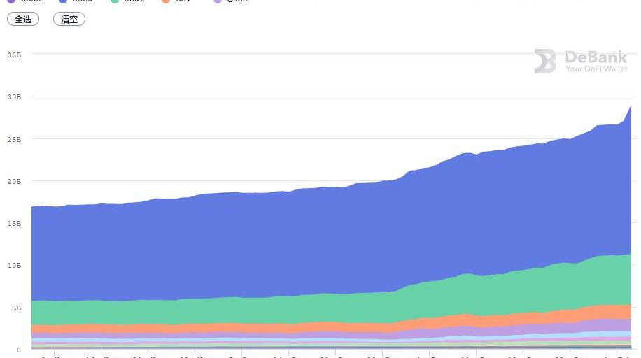 作为市值上升最稳定的一类资产,稳定币的发行量不断增加。1月底,以太坊上的美元稳定币发行量达到265亿,与上一个月相比增加55亿。其中,USDT的发行量增加20亿,USDC增加18亿,DAI增加4.6亿。