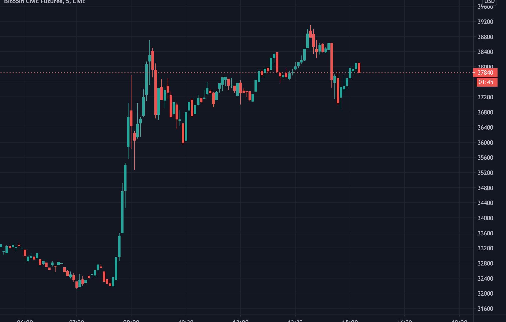 从图表上可以看出,CME的合约价格上涨了约500美元,溢价为1.3%。值得注意的是,TradingView将CME的数据延迟了10分钟,这意味着CME价格图表必须与Bitstamp上之前的K线进行比较。