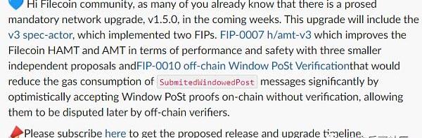 近日,Filecoin的官方人员在slack频道里面发布了一些消息,消息的内容大致意思是:filecoin网络会在未来的几周里面进行强制性的升级,这个升级会把Filecoin网络强制更新到v1.5.0的版本,这里面包含了FIP的两个提案