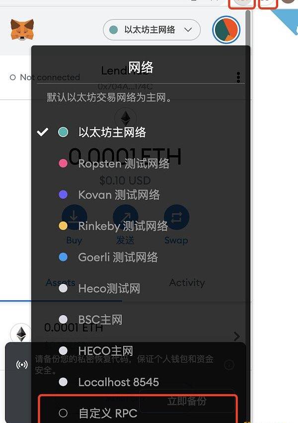 ①点击“扩展程序”;打开“Metamask插件”扩展程序;选择“自定义PRC”,添加自定义网络。