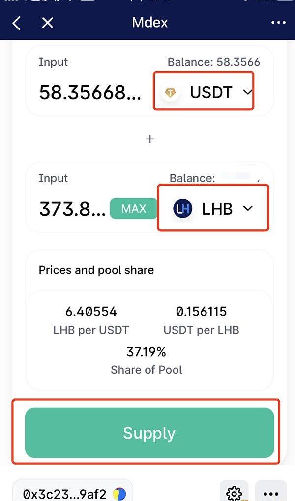 5、进入后或默认选择和,输入质押的LHB和USDT的数量,再分别点击和并调用合约进行确认,最后点击,调用合约确认后,质押成功并获得USDT/LHB的LPToken