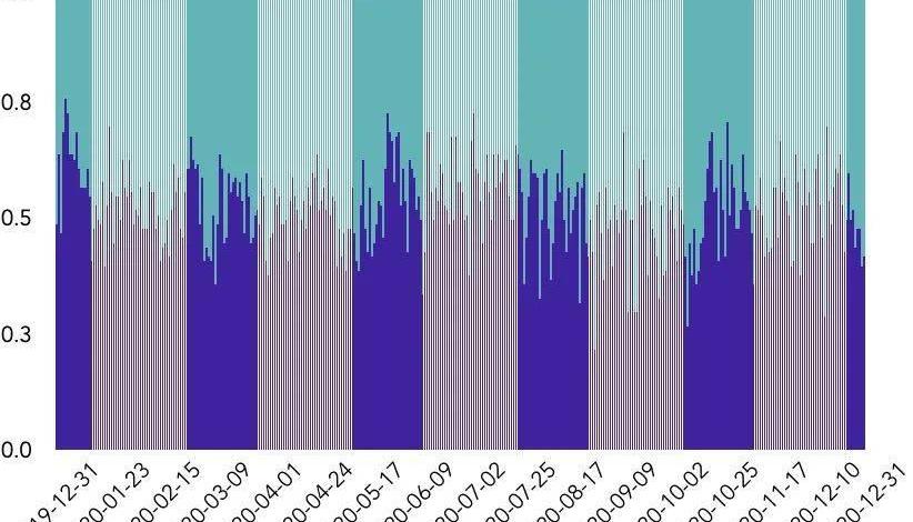下图为Deribit交易所2020年全年多空比。结合大额交易相关信息,可以发现,由于集中了大量机构投资者,Deribit交易所内的用户群体相对而言较为成熟,“312”事件及比特币在2020年出现的几次震荡行情并未对多头和空头双方造成明显影响,多空比一直维持在0.5附近上下稳定波动,全年未出现多空双方显著失衡情形。