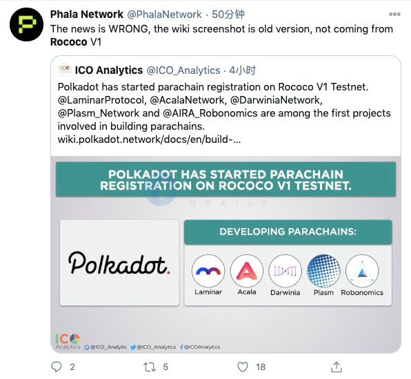 尽管比预期时间稍微晚了两天(原计划 1 月 11 日开放注册),但头部项目的关键性进展显然足够吸引眼球,社区之内热议不断。Odaily 星球日报留意到,早间曾有这样一则消息在各大社群内广泛流传——「参与 Rococo V1 构建的首批项目包括 Laminar Protocol、Acala Network、Darwinia、Plasm 以及 Robonomics」。然而,波卡生态隐私项目 Phala Network 则表示,该信息来自于波卡官方的 Wiki 百科截图,截图实际上是 Rococo 测试网的旧版本内容,并不是指这五家项目将作为首批项目参与 Rococo V1 版本的测试。
