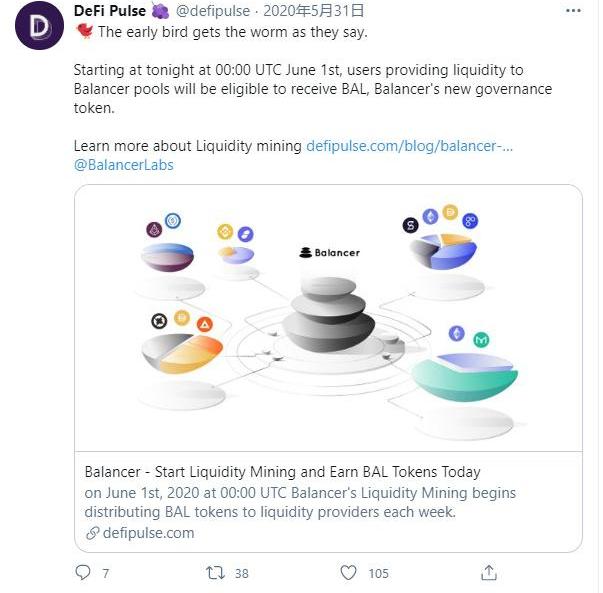 6月1日,去中心化交易所Blancer宣布,将引入社区治理代币BAL的提案,并于6月1日宣布开始正式执行「流动性挖矿」代币机制,试图利用其代币BAL的注入为Balancer协议的早期采用者提供经济刺激以促进更多流动性提供者的加入并参与社区治理。