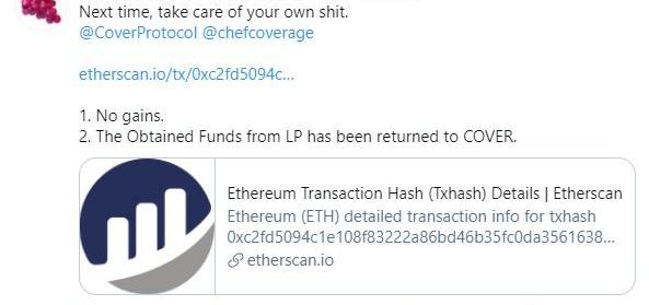 12月28日,DeFi保险协议Cover遭遇2次增发攻击,而其代币价格在攻击的影响下从700多美元一度暴跌至最低9美元,而在所有人绝望时,黑客又销毁了无限增发的代币,并将其卖得的4000多枚ETH归还了Cover团队,并在推特上发布了这样一段话:“takecareofyourshit”