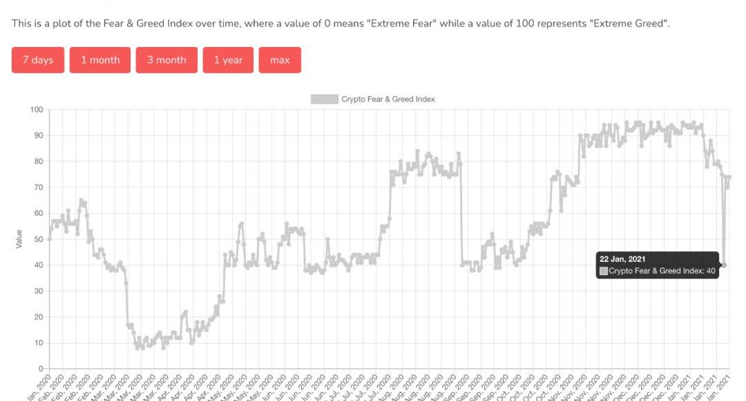 可是,永恒牛市没有如期而至。过去两个星期,比特币震荡下跌,1月22日一度跌破了两万九。几天内万刀大跌可是过去想都不敢想的,恐慌贪婪指数骤跌至40,各种社区、社群里也是讨论的很激烈,把#比特币跌破三万美金#的话题都送上了微博热搜榜。