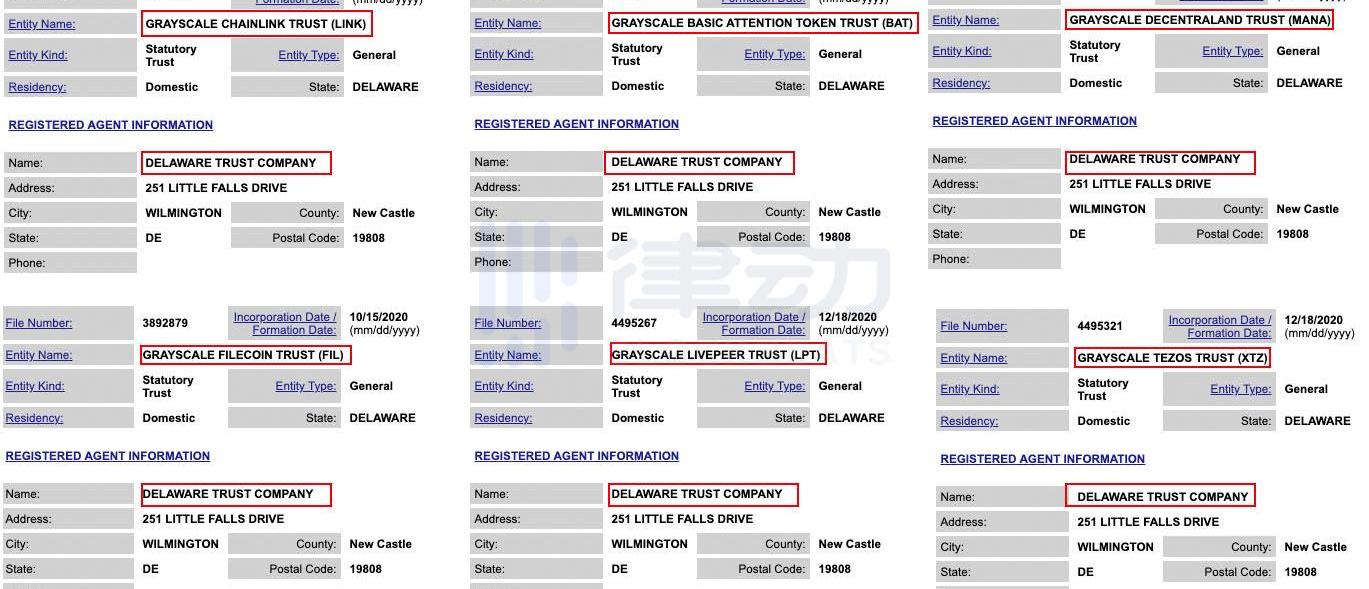 同时,律动BlockBeats查询,新增加的六大信托实体皆通过特拉华州信托公司进行登记代理,并且注册时间均为2020年12月18日。