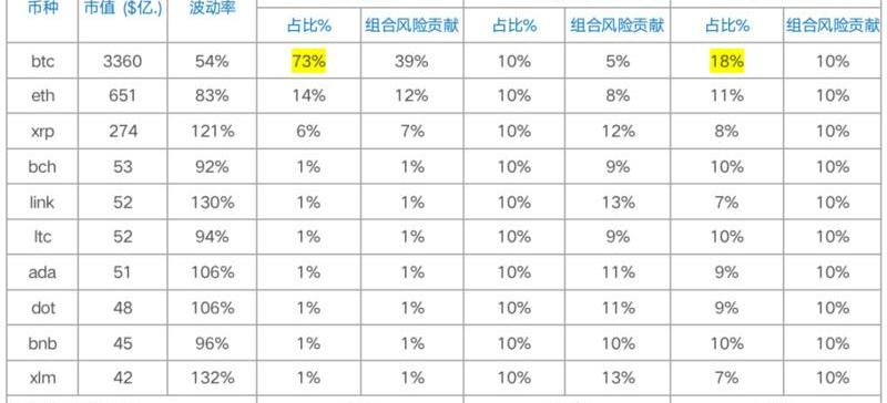 表5展示了市值前十以外的组合情况,这部分加密货币使用波动率加权可以降低投资组合的预期风险,原因可能是市值排名11至100的加密货币市值和波动率的分化没有那么严重。