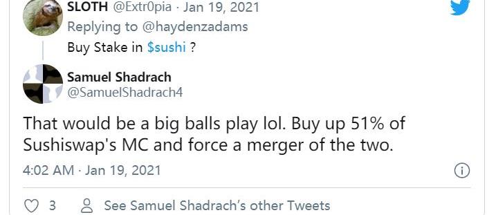 DeFi评论员SamuelShadrach断言,Uniswap应该收购SushiSwap的大部分供应,迫使两个平台合并。