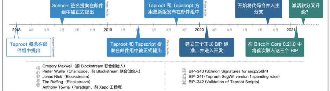 当我们整理比特币核心开发者针对SchnorrSignature和Taproot进行讨论和研究的时间线时,发现这个方案从提出到集成已经超过了3年的时间。