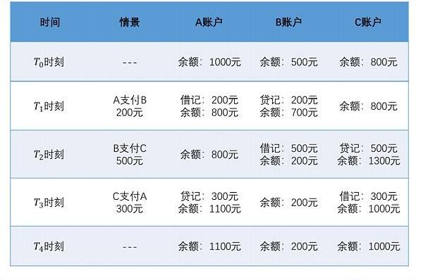 ?T0时刻,A的账户里有1000元,B的账户里有500元,C的账户里有800元。