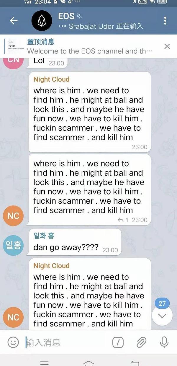 愤怒的投资者开始涌进EOS电报群,用工地英语发出怒吼:“wehavetokillhim.”