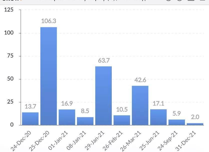 从未平仓量角度看,在比特币价格稳定在22,000美元以上的当下,期货与期权的未平仓量亦达新高。从期权斜率看,更加陡峭的期权斜率,表明现货与期货市场的火热也在期权市场得到了佐证。此外,比特币价格的短期波动并未对期权与期货市场造成明显影响,表明投资者对于比特币的看好依旧持续,并已对比特币目前的价值达成了阶段性共识。