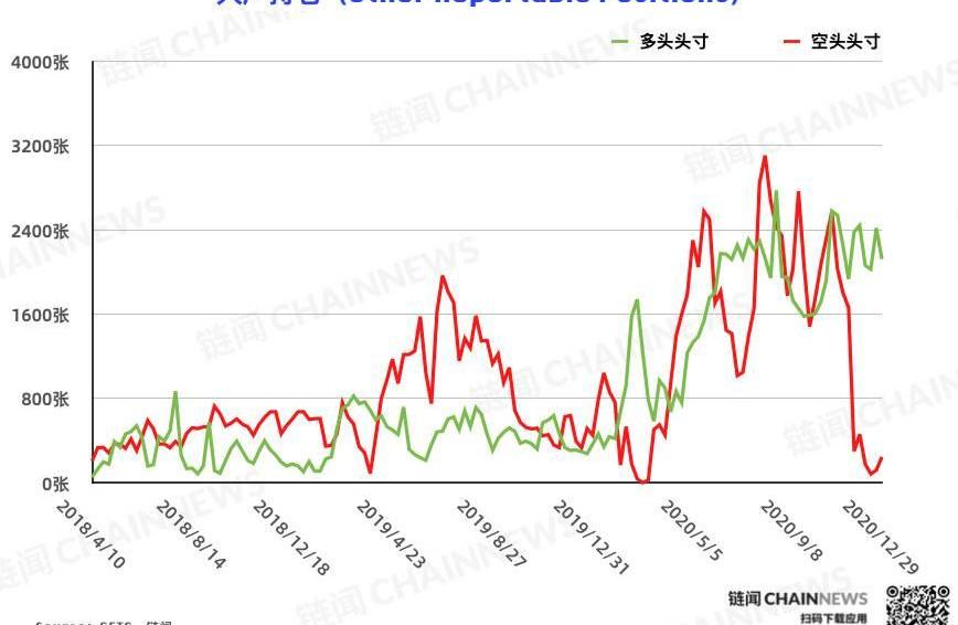 分项数据上来看,规模较大的经纪商持仓多头头寸自573张进一步上涨至620张,创近四周新高,空头头寸自30张微涨至32张,大型机构在最新统计周期内仍然进行了相当明确的多单增持,相比于大幅下降的总体持仓表现,经纪商账户在这个行情持续快速上涨的背景下仍然表现出了相当强的追涨信心,而从结果上来看BTC也确实在新年伊始就完成了对于30000美元整数大关的强势突破,大型机构在2020年收官的一期周报中再度表现出了精准的判断能力,在市场的减仓潮中「力排众议」继续追多的一手操作相当精彩。