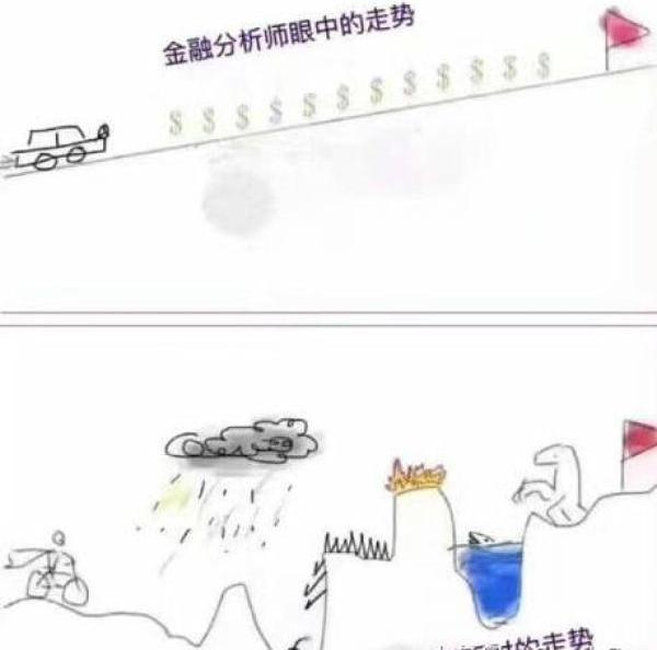 如上图,在金融分析师眼里,理论价格应该由A直线到B,假设金融分析师是对的,市场也认可他的分析,但是专业投资者共识的标准差小,于是最后走势如图A。