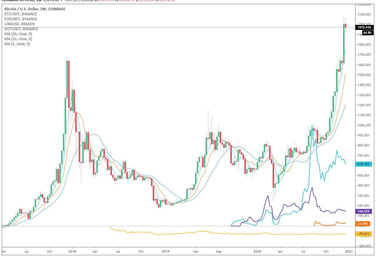 比特币周线图与Chainlink、Polkadot、EOS和Tezos的比较?来源:TradingView.com
