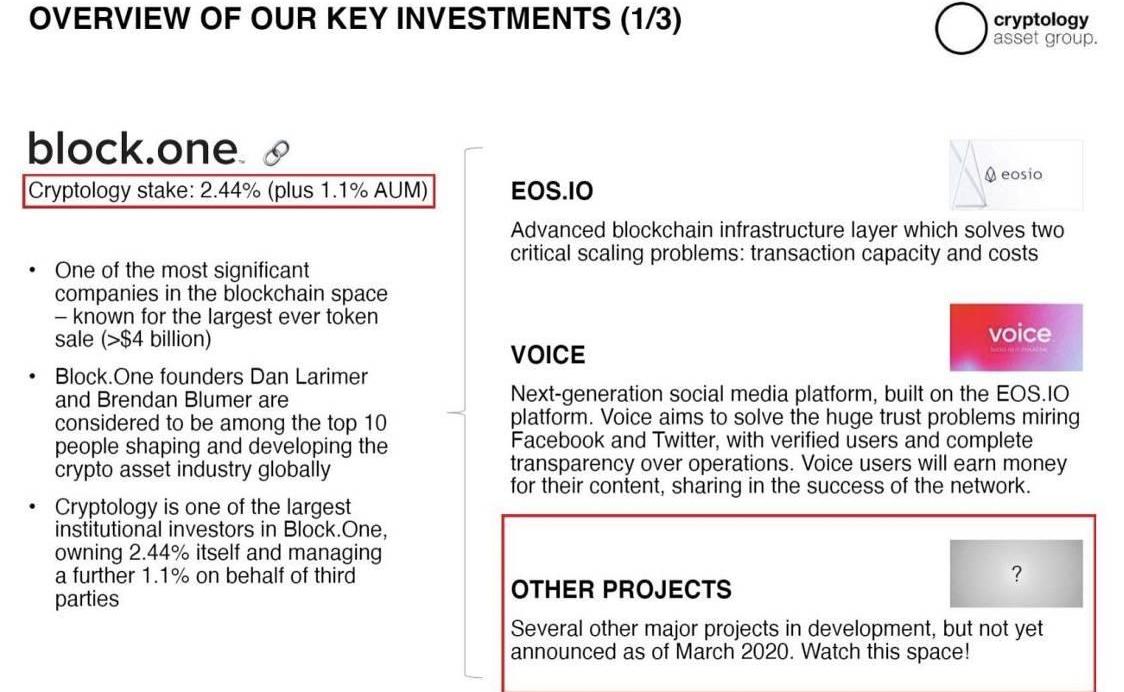 Cryptology独立拥有Block.one的2.44%,再加上通过第三方获得的1.1%,它总共拥有3.54%的股份。