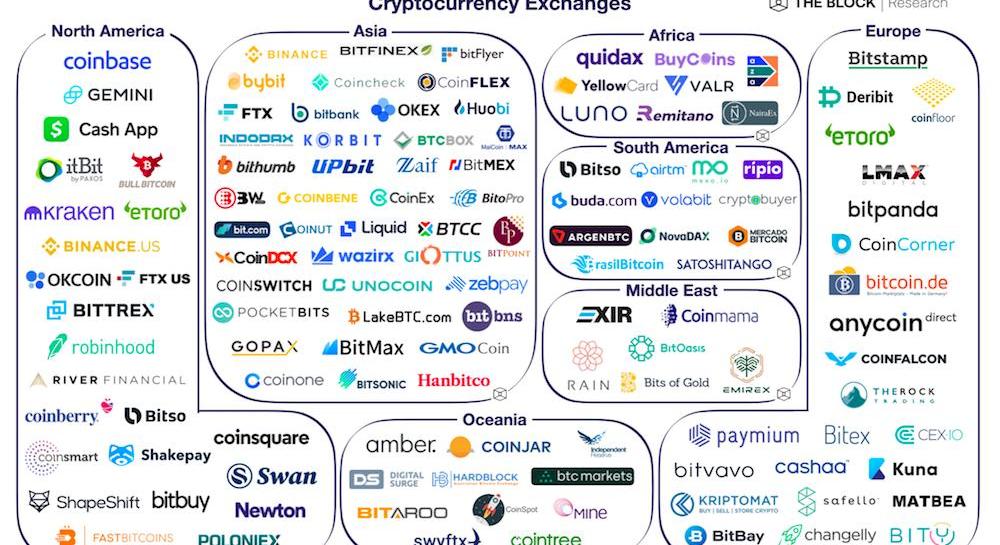 TheBlockResearch分析了123家现货和衍生品加密货币交易所,这些交易所要么满足特定地区的需求,要么是国际化运营。在这次研究发布中,我们将交易所按照以下几个地域进行划分:非洲、亚洲、欧洲、中东、北美、大洋洲和南美。