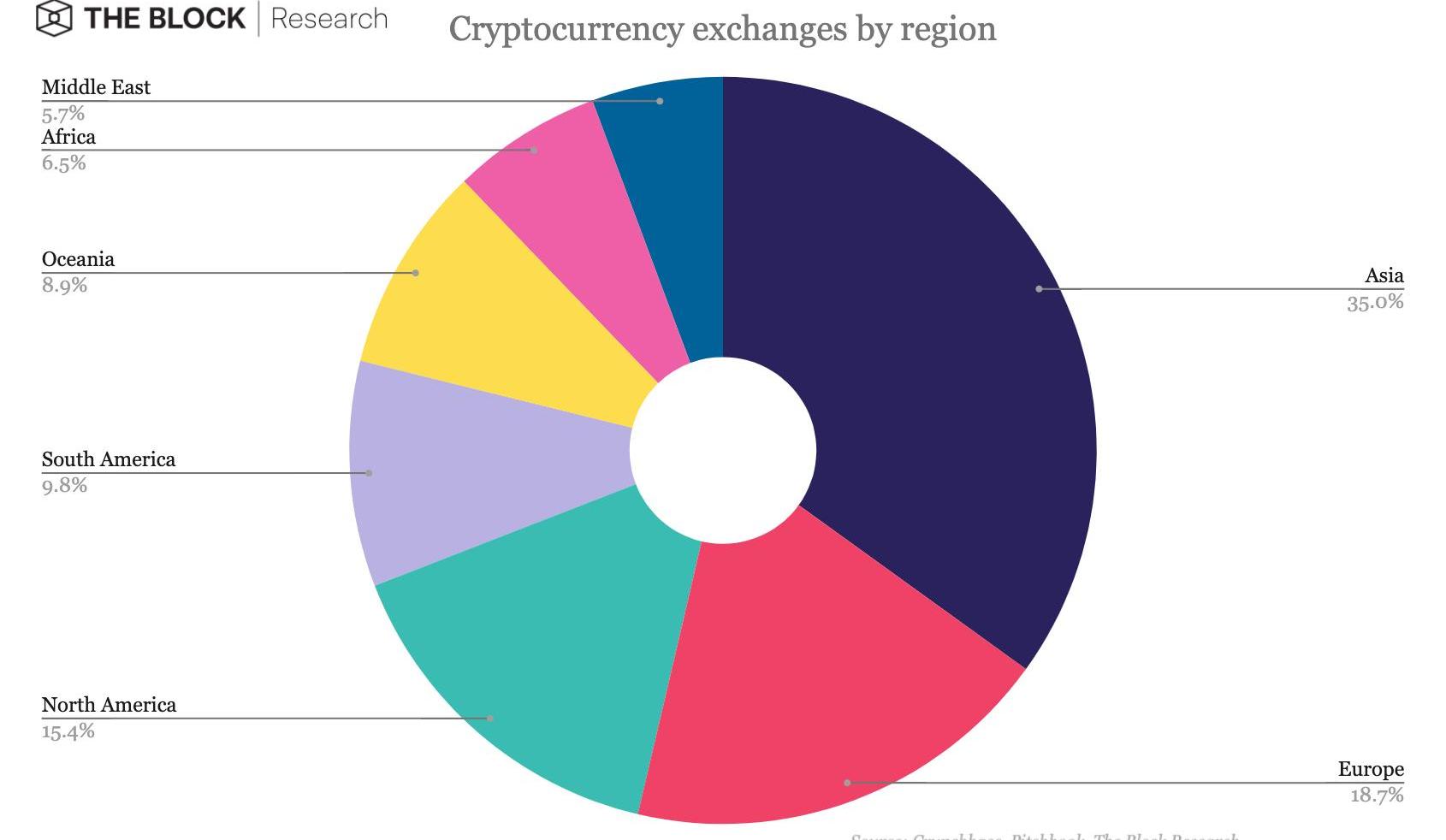 从地区来看,亚洲、欧洲和北美的加密货币交易所数量最多,总共占到加密货币交易所的69%左右。亚洲是数量最多的地区,占总数量的35%,主要需求来自于中国、印度、日本、新加坡和韩国。