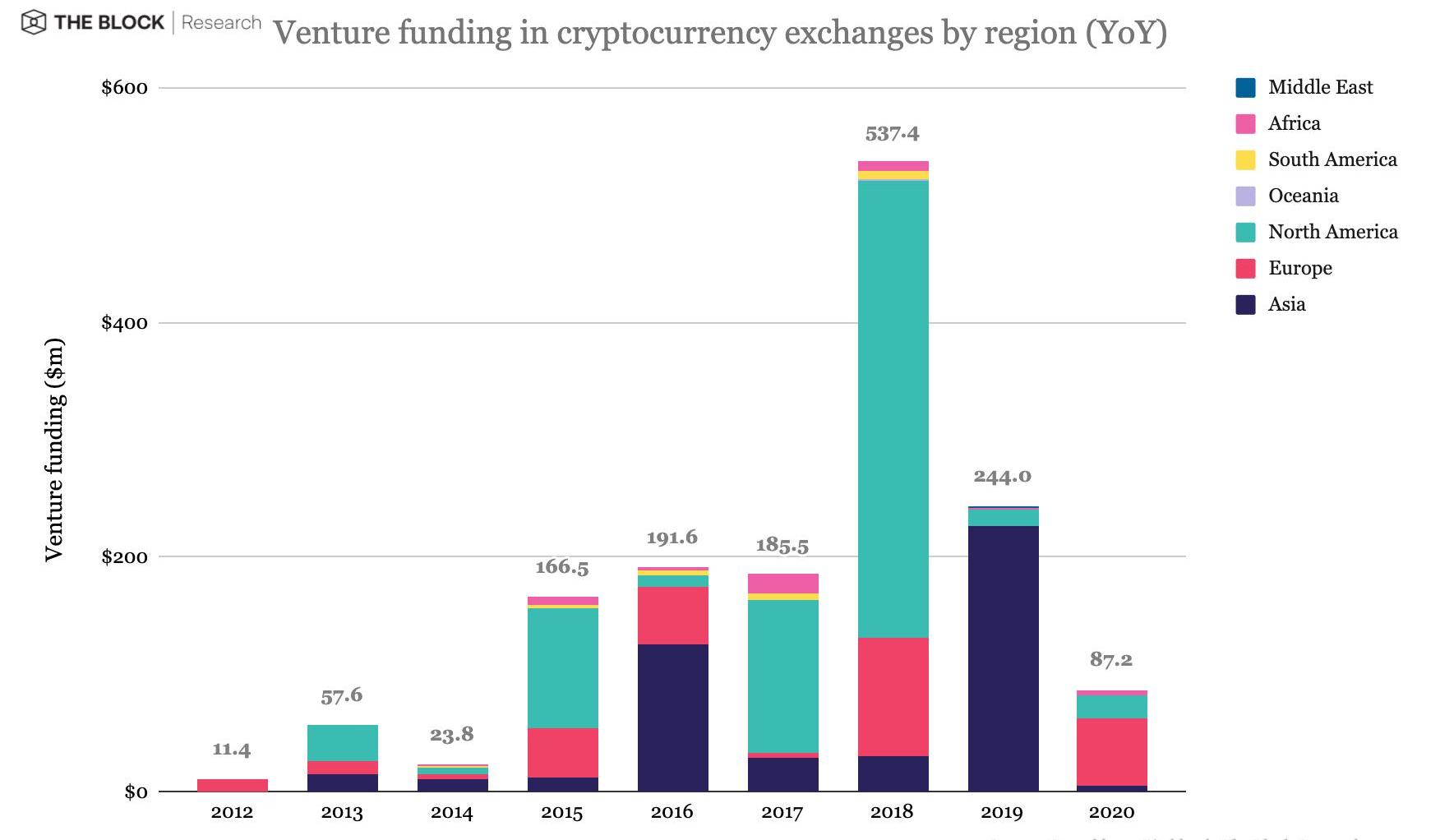 自2012年以来,共发生200起交易所风险投资事件,共涉及15亿美元的风险投资资金。尽管北美在交易所数量上落后于亚洲和欧洲,但该地区获得的资金最多,占所有风险投资的47%。北美的总投资数很大程度上是因为只有三个加密货币交易所,Coinbase、Kraken和Paxos(itBit)总共筹集了6.479亿美元,占该地区总资金的91%。