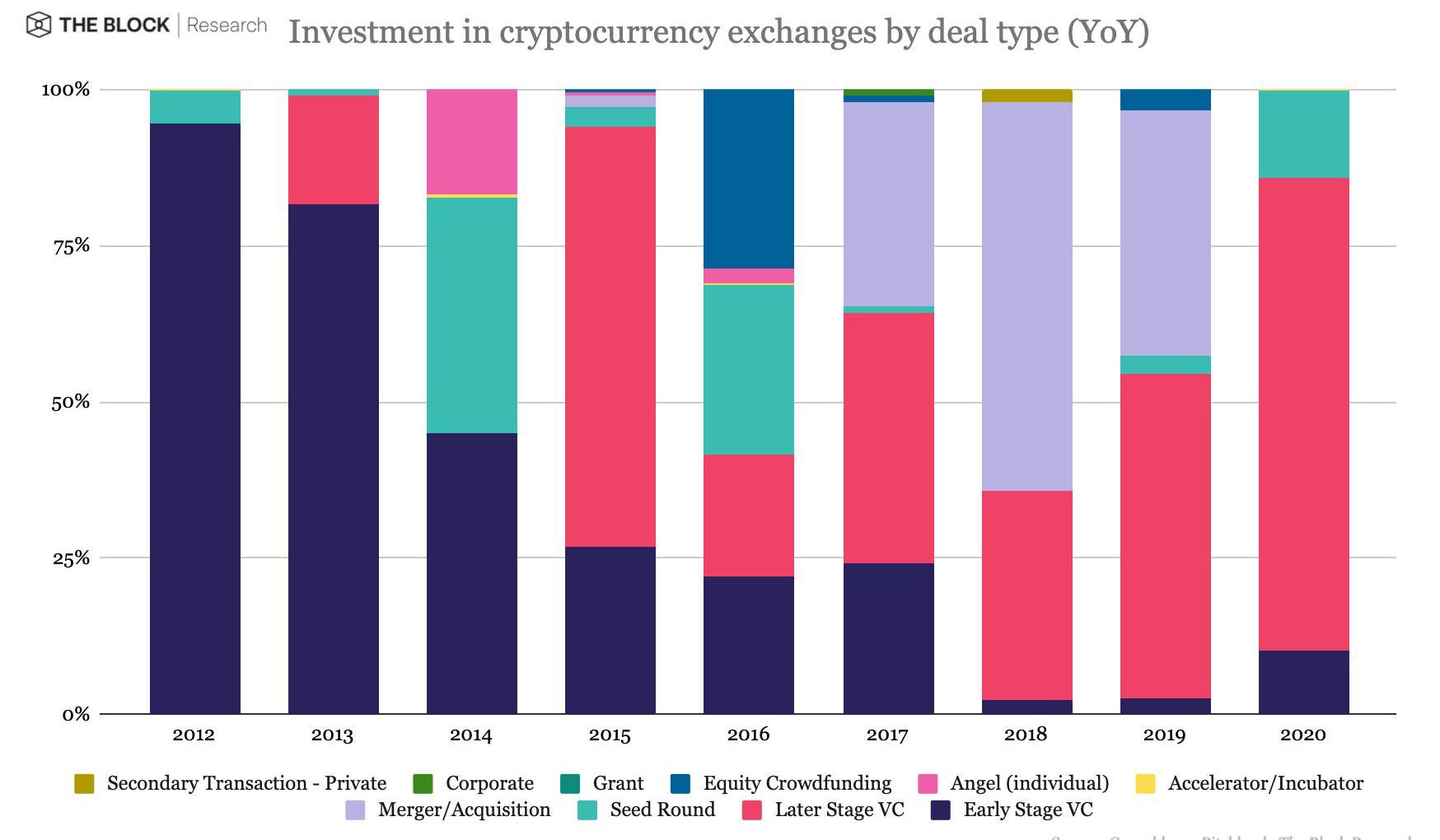 在涉及购买加密货币交易所的15笔交易中,总共花费了约11亿美元。结合风险投资,并购活动分别占2017年、2018年和2019年融资的32.7%、62.1%和39.2%。