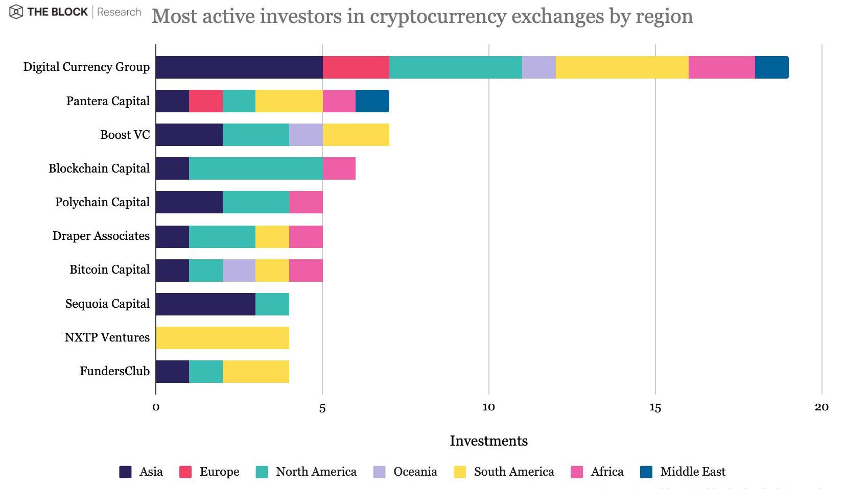 PanteraCapital和BoostVC是第二大活跃投资者,各自有7项投资。Pantera的投资覆盖了除大洋洲以外的所有地区,而BoostVC仍未在非洲、欧洲或中东地区的交易所投资。