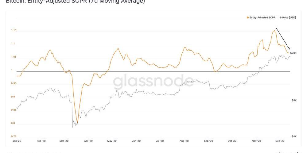 比特币的实体调整后的SOPR仍然处于1以上,但自11月下旬以来一直在下降,这表明正在实现的利润金额正在减少,尽管这段时间价格保持相对稳定。
