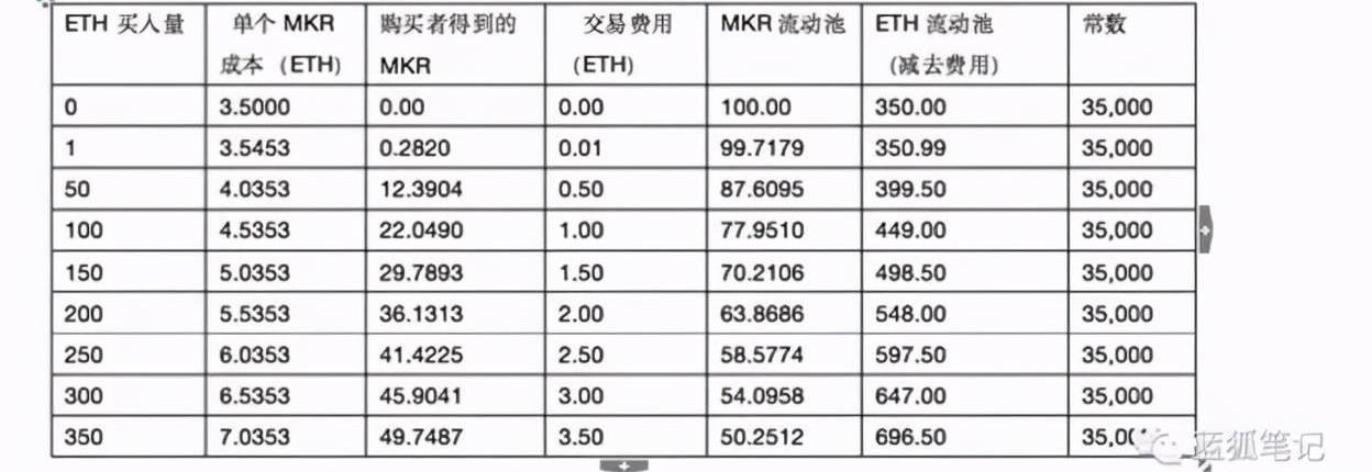 如果用ETH购入MKR,那么每次ETH买入量不同,其购买的成本也是不同的,如果往流动池中注入1ETH,用来兑换MKR,那么可以兑换0.282个MKR,成本为3.5453,购买MKR成本上涨了1.294%;如果用350ETH来兑换MKR,那么这意味着ETH流动池有696.5ETH,根据计算公式,MKR的流动池剩下50.2513个MKR,那么350ETH可以换得49.7487个MKR,而单个MKR兑换成本高达7.0353;购买MKR的成本上涨超过100%,这个滑点太大了。