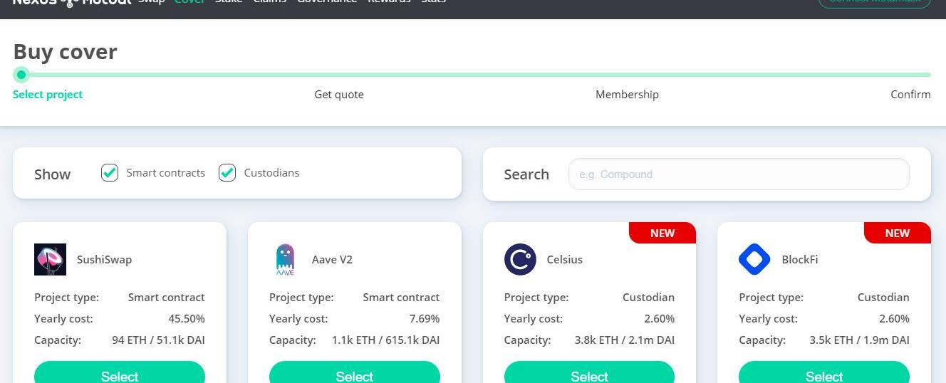 在NexusMutual官网,投保人可以使用ETH或者DAI为特定项目投保,目前支持64个项目,比其他保险协议丰富很多。NexusMutual引入了“去中心化风险评估”机制,与投保人相对应的“承保人”叫做风险评估师,往往是智能合约安全性审计专家,他们将通过质押代币的方式参与特定风险的评估,赚取系统给予的代币奖励。