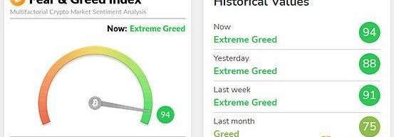 那么当前的比特币市场情况如何呢?自10月中旬以来,比特币价格从10,000美元左右跃升至目前的19,000美元左右。市场上很多人都对比特币抱有十分乐观的预期,认为比特币在年末可以冲上8万、10万美元;另一方面,在调研市场时,发现有不少投资者开始使用信用卡或者通过贷款投资比特币,这是十分危险的行为。从比特币贪婪指数看,目前已经达到94,市场处于极度贪婪狂热的状态。特别是从历史数据上看,自11月中旬以来,比特币贪婪指数就一直处于90左右的高位,这是一个相当危险的信号。