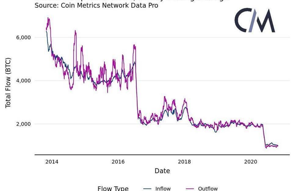 随着矿工的供应量逐渐减少,其地址的净资金流稳定下来,矿工对比特币网络的影响似乎较小。