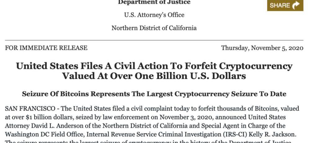 11月5日,加利福尼亚州北区美国检察官大卫·L·安德森宣布,美国已提起民事诉讼,将没收与“SilkRoad”有关的69370枚比特币。