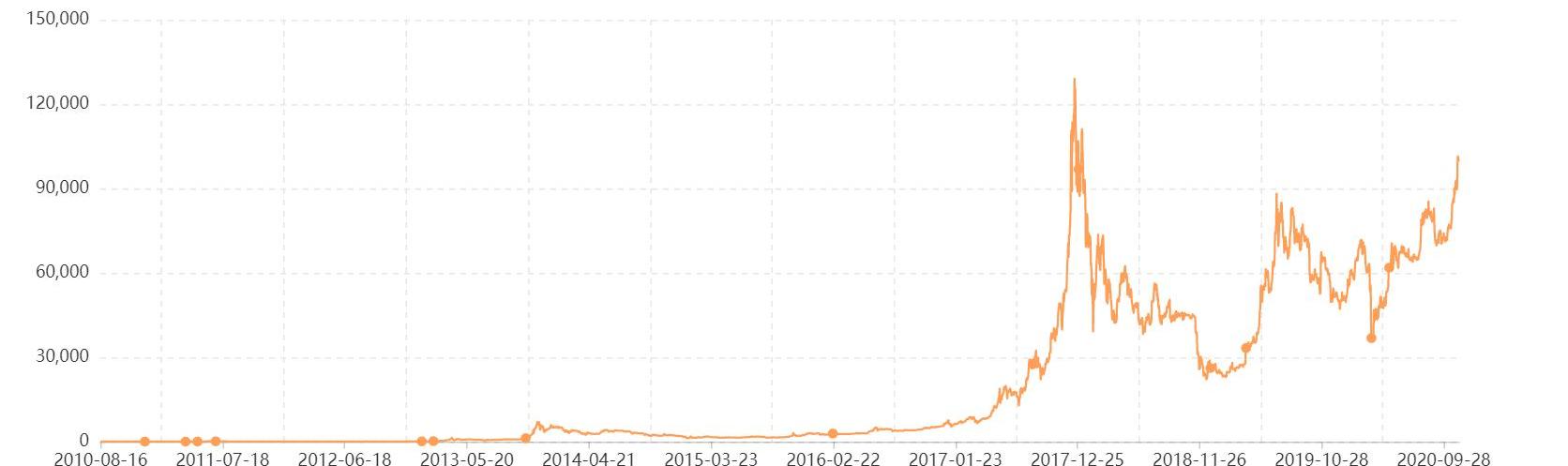 1个比特币的价格从早期的0.0655美金,到2017年底的最高点19,535.7美金,达到了不可思议的298,255倍涨幅!
