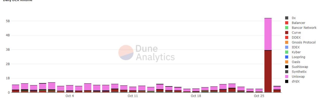 10月下半月,DEX交易量遭遇8月以来最糟糕的一周。周交易量从9月第一周的80亿美元下降到10月19日至25日的约30亿美元。Uniswap仍占所有DEX交易量的56%市场份额,并遥遥领先。