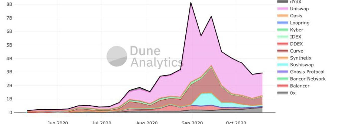 夏天结束后,DeFi热度有所回落。我认为,这是很自然的。周期性炒作超过了实际增长,紧随其后的会是一段降温期。然而,从根本上看,没有什么影响到DeFi和DEX的增长。新项目正在开发中。
