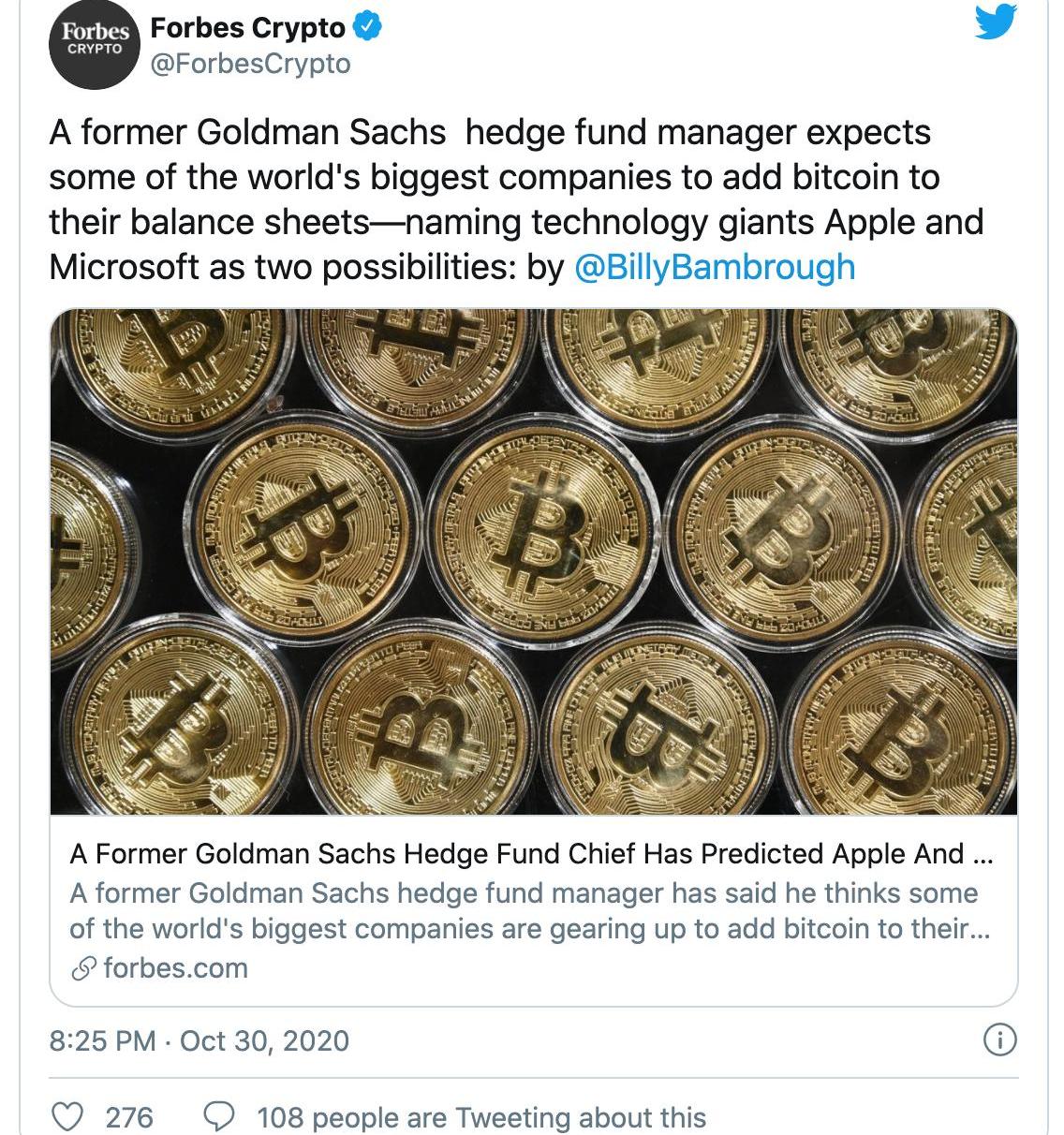 看来我们正在慢慢地进入比特币投资领域,之后就不会在回头了。前高盛对冲基金经理RaoulPal最近预测,像微软和苹果这样的巨头可能会进入BTC。