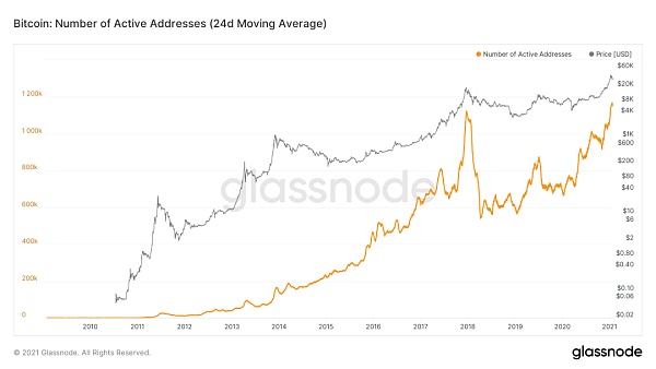 从比特币链上数据来看,Glassnode数据显示,Glassnode数据显示,当前每小时活跃的比特币地址数量为115.1万个,虽较前几日历史新高已有小幅回落,但仍高于2018年1月初111.7万个的峰值。