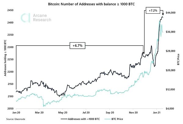 高净值人士与机构投资者可谓是本轮加密市场牛市的主力军。Glassnode的数据也从侧面证实了这一点,研究机构Arcane Research近日引用Glassnode数据指出,持有100枚以上比特币的地址数量也正急剧攀升。其中,自去年12月以来,持有至少1000枚比特币的地址数量已增长了近7.2%。相比2020年,加密货币鲸鱼数量增加了6.7%。