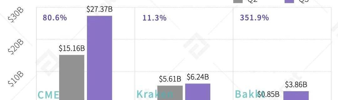 Bakkt、CME和KrakenFutures为本次报告所获取数据之合规交易所,本季度三者共报成交量$37.47B。三家合规交易所中,CME和Bakkt专注于衍生品交易服务的提供;而Kraken现货业务本季度成交量为$22.16B,为其衍生品成交量的$3.6倍。