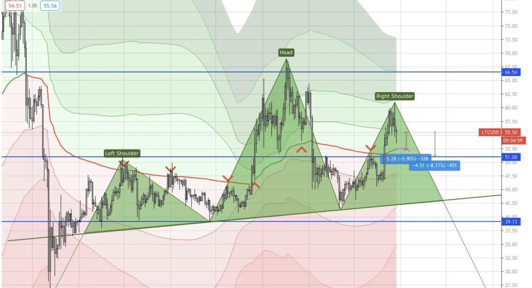 如果服从头肩形态,首先LTC会向51美元回落。如果LTC继续回落,跌向基本面绿线(颈线),LTC将触及44美元左右。