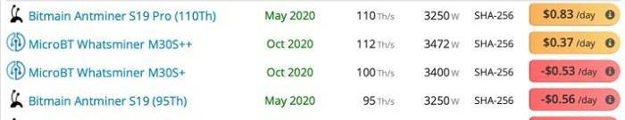 如果查看实时挖矿硬件聚合器asicvaule.com上的数据,并按照每千瓦时电费0.06美元筛选,会发现在基于SHA256挖矿算法的加密货币矿机中: