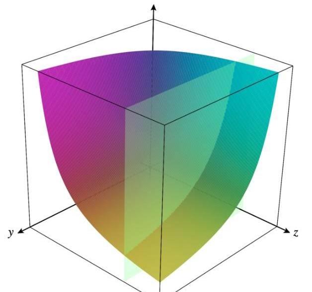 三维曲面为函数xyz=k所绘制的图形,绿色为z=const.的平面,两者相交即为双曲线将z视为常数之后,剩下由x和y两个自由度所构成的二维曲线与前述之Uniswap数学模型完全相同。