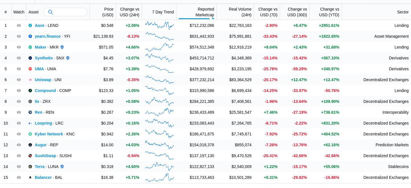 如上图所示,在过去30天内,主要DeFi协议的收益猛增。然而,DeFi代币的价格暴跌20%至82%。例如,Maker在过去30天内下降了24%,但在同一时期,其收益却增长了449%。