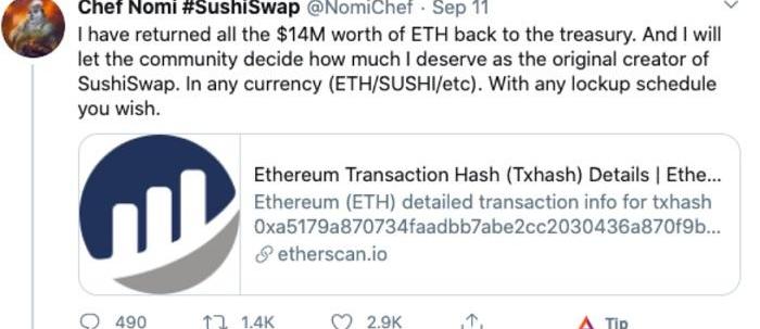 2020年9月11日,Nomi大厨在道歉推文中提供了确切的交易哈希,并暗示所有取出的ETH都已经退回到“寿司”Sushiswap库存账户:
