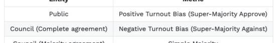 当提案通过与之相关的特定投票指标时,提案就会获得通过。根据谁提出的公投,决定了需要多少用户才能通过它们。你可以看到下面的表格,其中显示了提议公投的实体和定义需要多少用户投票才能通过公投的指标。