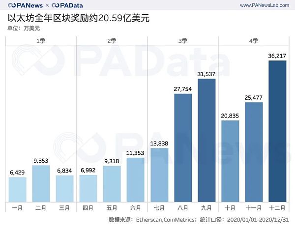 每日新增供应量的美元市值即为每日区块奖励的金额,根据统计,2020年全年以太坊的区块奖励约为20.59亿美元。其中12月和9月的区块奖励总额都超过了3亿美元,最高的12月达到了3.62亿美元。其次,8月、11月和10月的区块链奖励总额也超过了2亿美元。