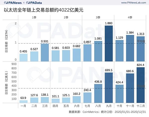 以太坊全年链上结算总额约为11.41亿ETH,相当于4022亿美元,美元本位下,这相当于比特币的1/16。